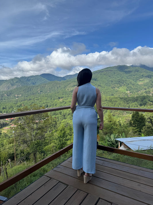 Jumpsuit estampado floral pierna ancha azul claro y blanco