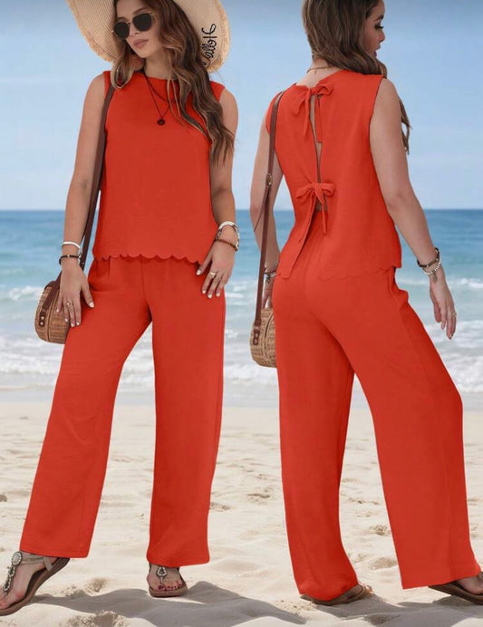 Conjunto anaranjado floral de 2 piezas para mujer: top corto smock sin mangas + pantalón de pierna ancha con cierre (zip).