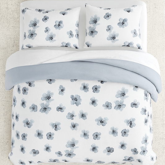 Kaycie Gray Watercolor Floral Printed Duvet Cover Sets Azul, 3 Piezas, King