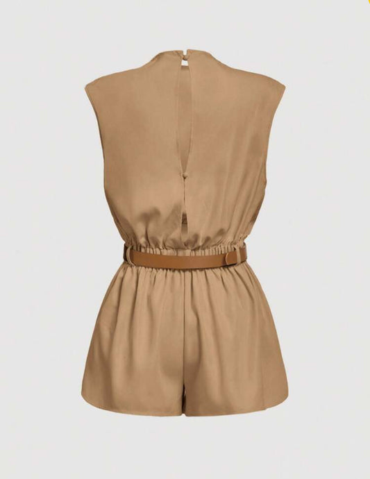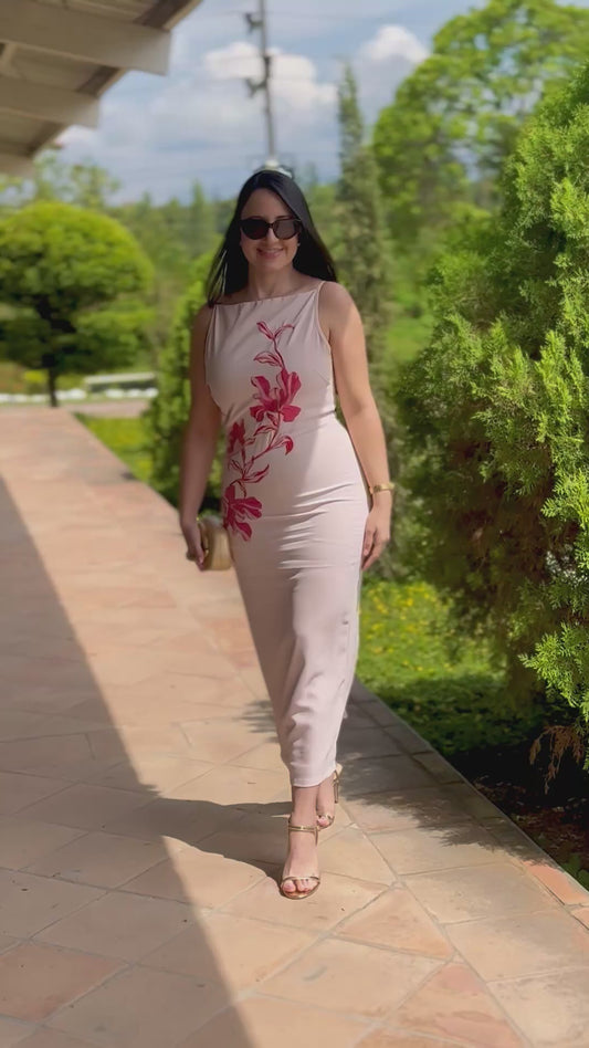 Vestido Beige ajustado con cuello cruzado y mangas de farol