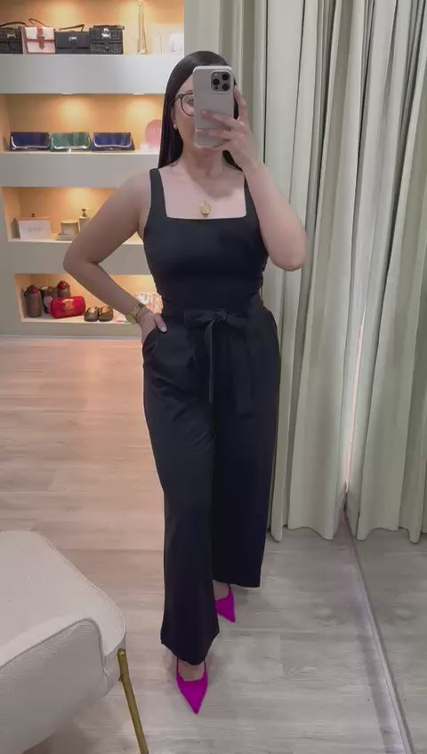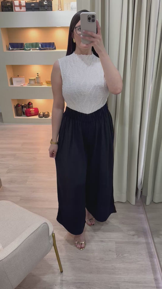 Conjunto negro de blusa sin manga y pantalón pierna ancha