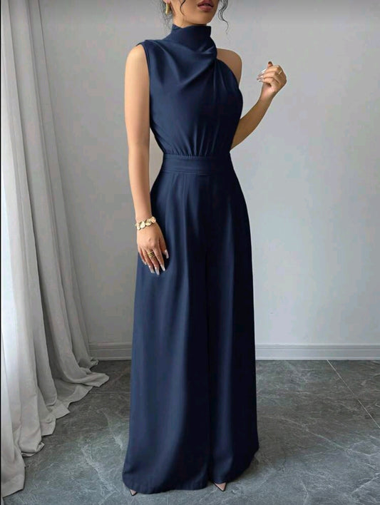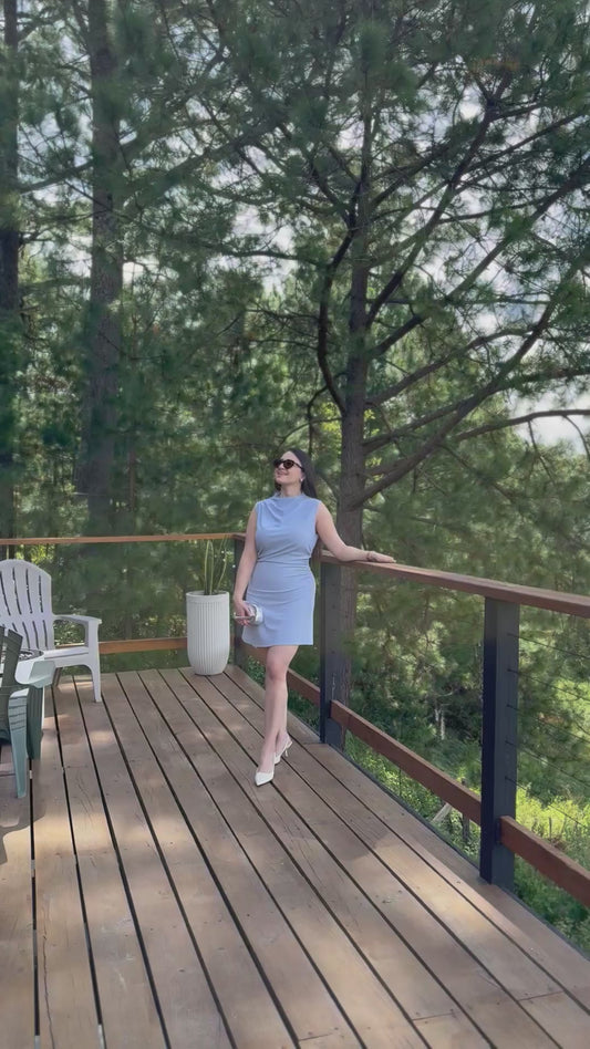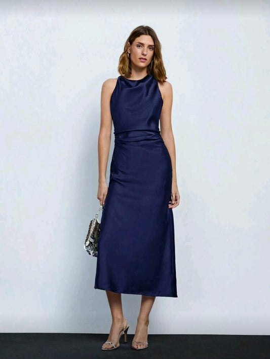Vestido Azul Elegante Largo con Cuello Fruncido