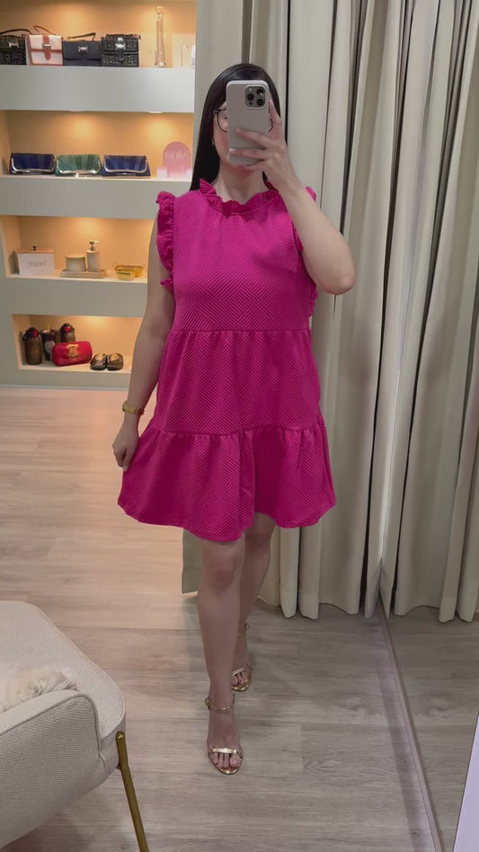 Vestido fucsia sin mangas para mujer con botones al frente, bolsillos frontales y cintura elástica.