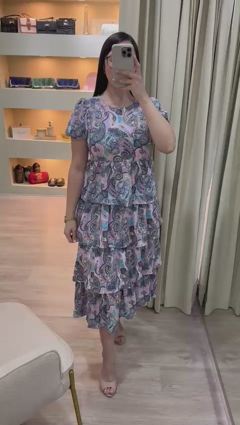 Vestido midi morado para mujer con mangas cortas abullonadas, diseño en capas (tiered) y estampado paisley.