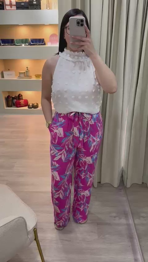 Pantalón blanco palazzo de pierna ancha con bordado floral