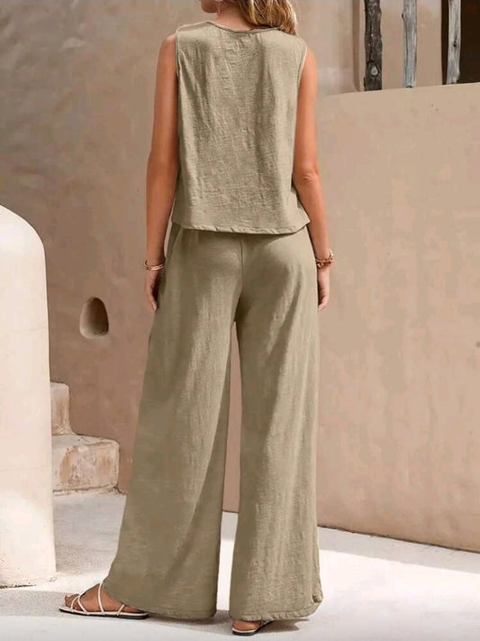 Conjunto beige relajado de camisa sin mangas y pantalón pierna ancha