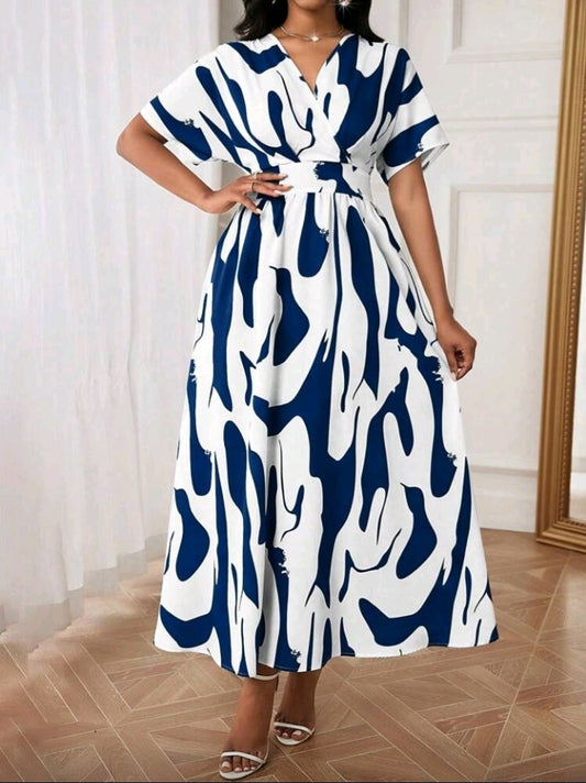 Vestido maxi azul elegante de manga corta y cintura elástica
