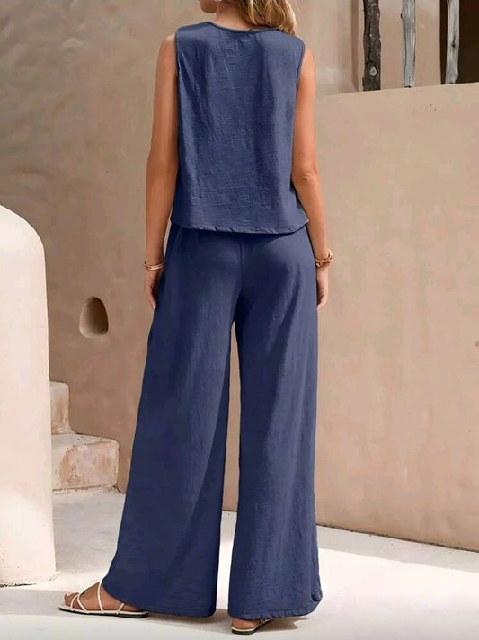 Conjunto azul oscuro relajado de camisa sin mangas y pantalón pierna ancha