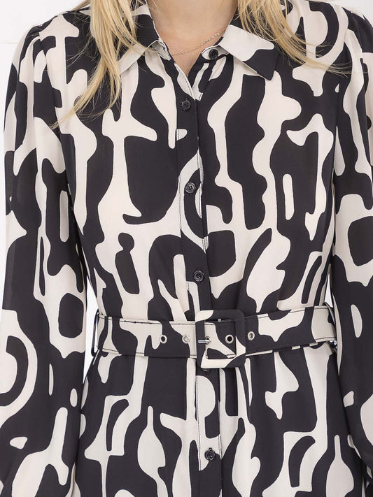 Vestido blanco y negro midi manga larga de botones y cinturón