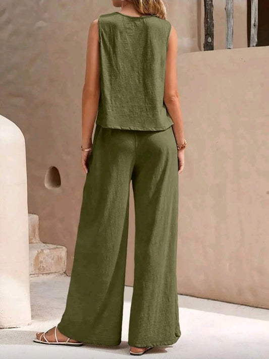 Conjunto verde relajado de camisa sin mangas y pantalón pierna ancha