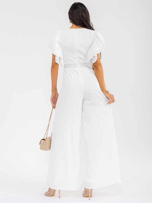 Jumpsuit blanco de pierna ancha con escote cruzado y mangas cortas con volantes