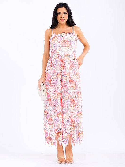 Vestido rosado maxi floral detallado sin mangas para mujer.