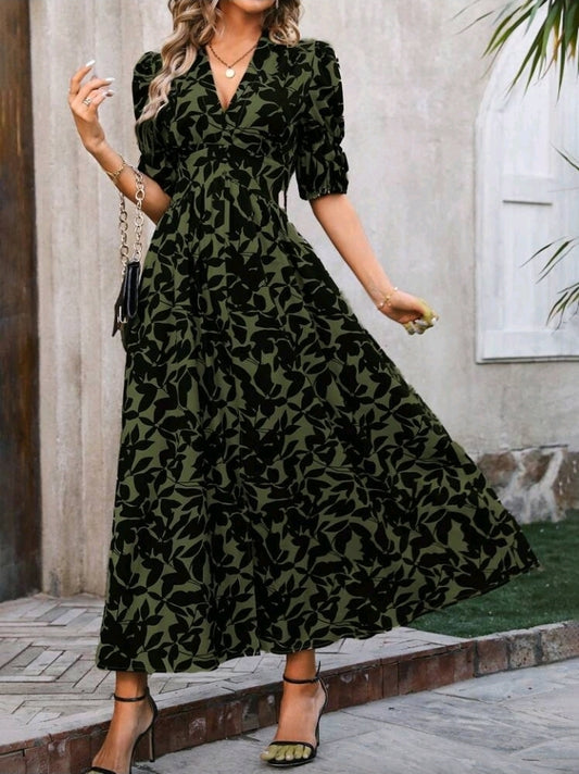 Jumpsuit verde para mujer de pierna ancha con manga larga, escote cruzado (surplice), cintura elástica y estampado multicolor.