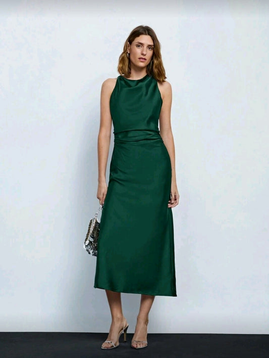 Vestido Verde Elegante Largo con Cuello Fruncido