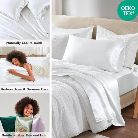 Madison Park Essentials Satin Sheet Set Luxury and Silky with Natural Sheen, Elastic 14" Pocket fits up to 16" Mattress, All Around Elastic - Year-Round Bedding, 6 Piezas, Blanco, King