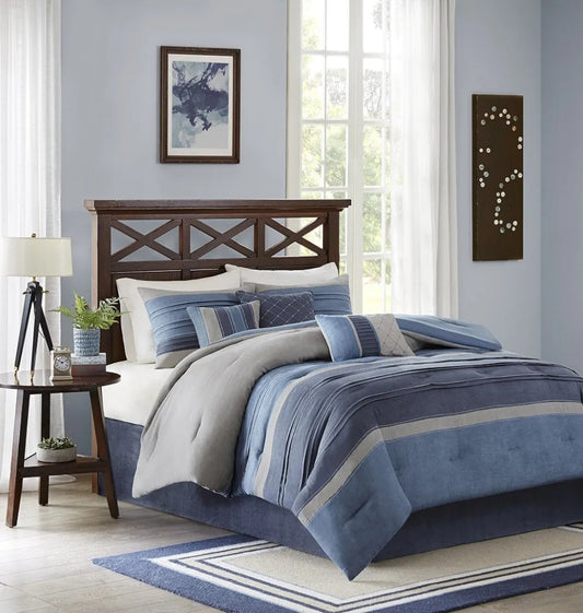 Madison Park Collins 7 Piece Comforter Set Suede Blue Grey King, Azul
