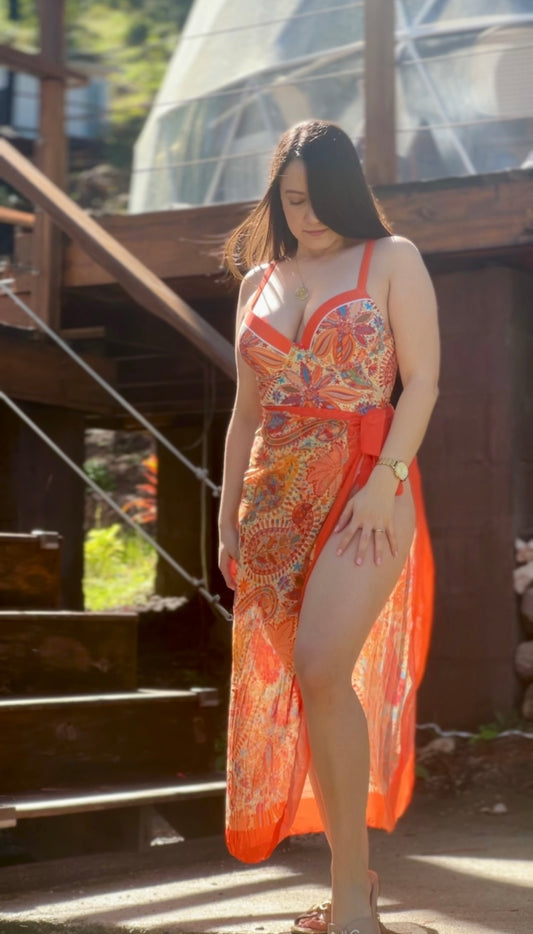 Traje de baño estampado anaranjado con salida de baño y efecto push-up