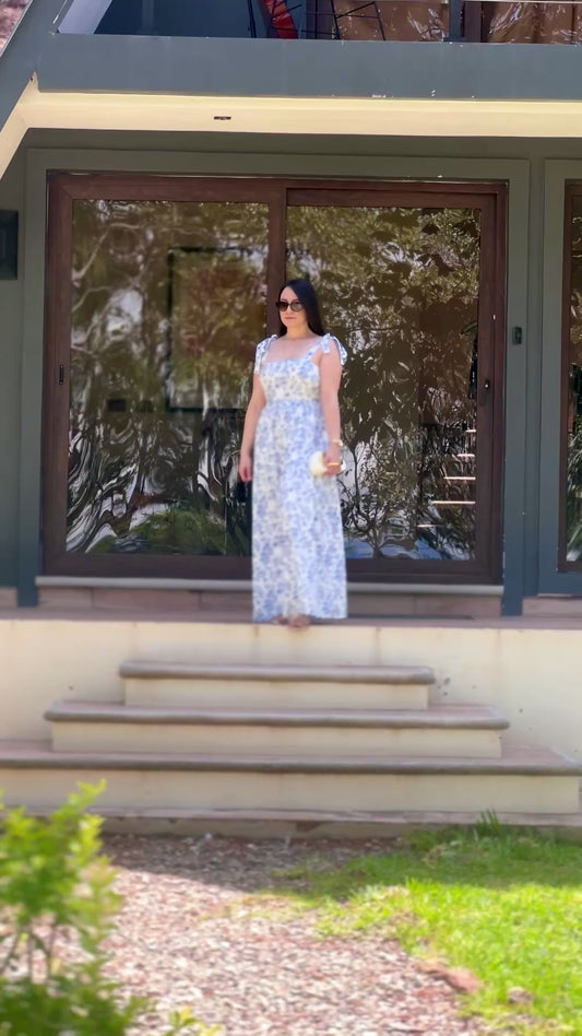 Vestido blanco largo con estampado floral plisado y volantes elegantes