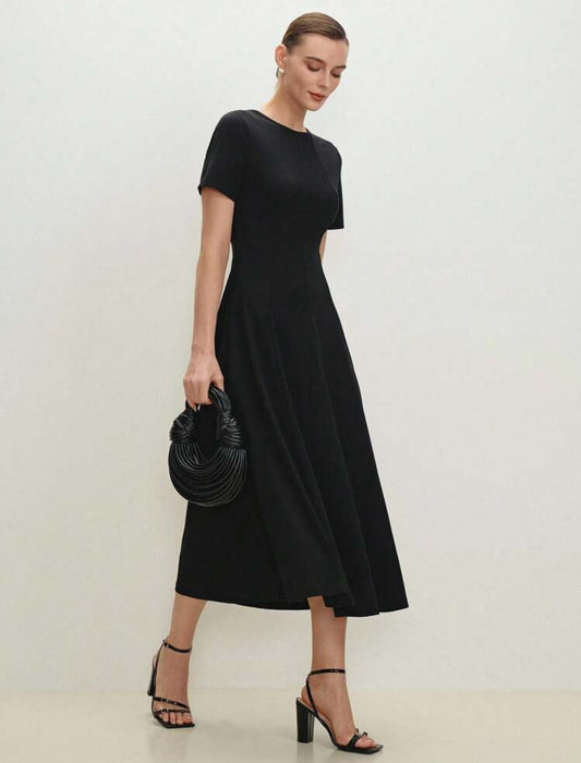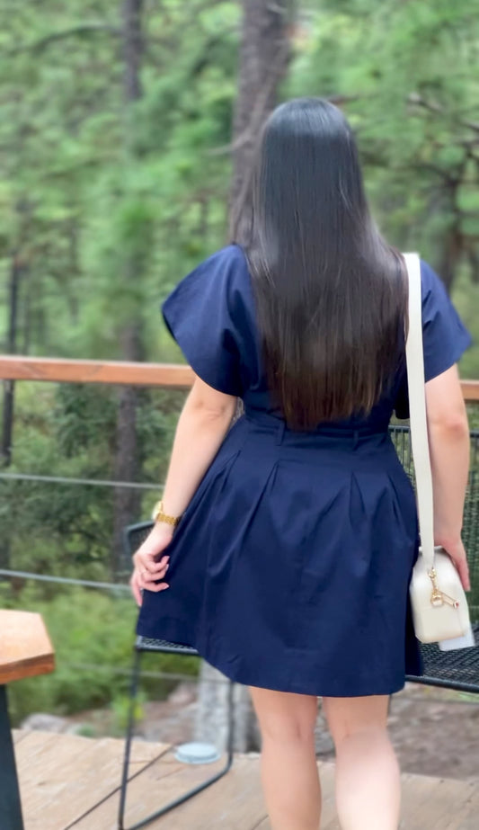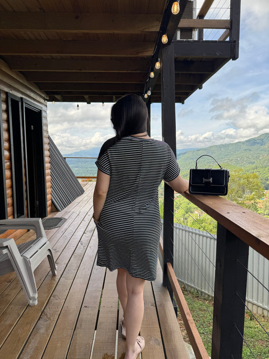 Vestido negro lineas blancas, manga corta, de cuello redondo con bolsillos