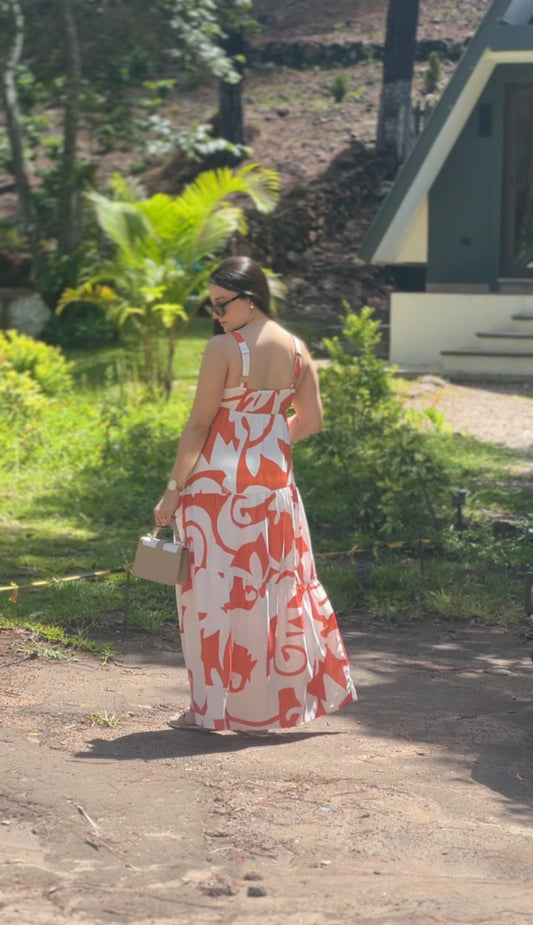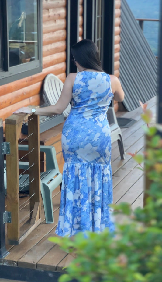 Vestido blanco largo con estampado floral plisado y volantes elegantes