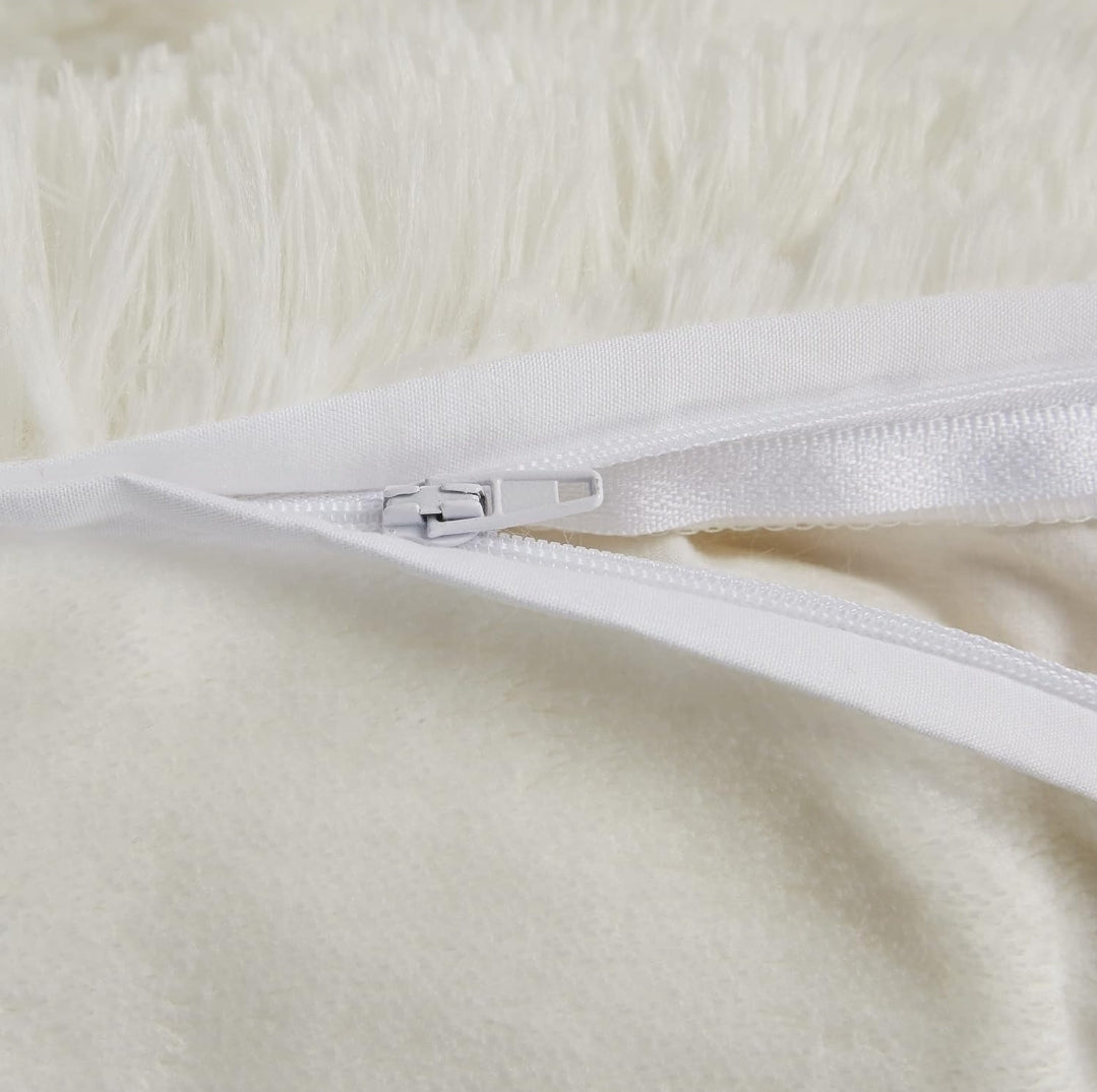 - Material: Funda exterior de poliéster con pelaje largo sintético (faux fur shaggy) y parte interna reversa tipo plush, también en poliéster—muy suave al tacto.