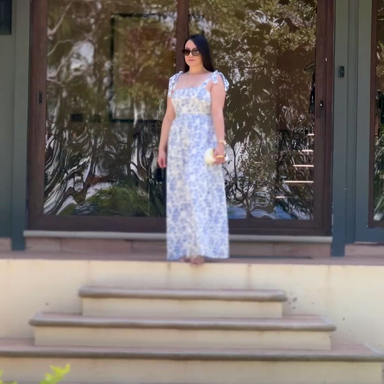 Vestido blanco largo con estampado floral plisado y volantes elegantes