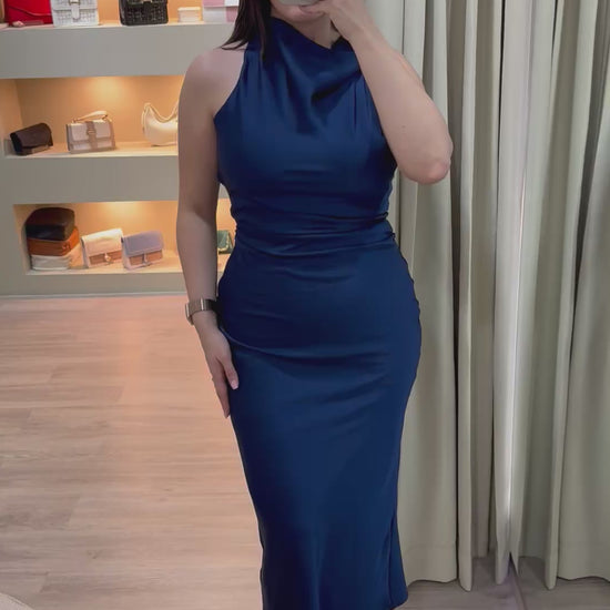 Vestido Azul Elegante Largo con Cuello Fruncido