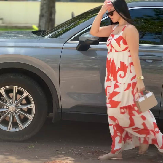 Vestido largo blanco con estampado anaranjado