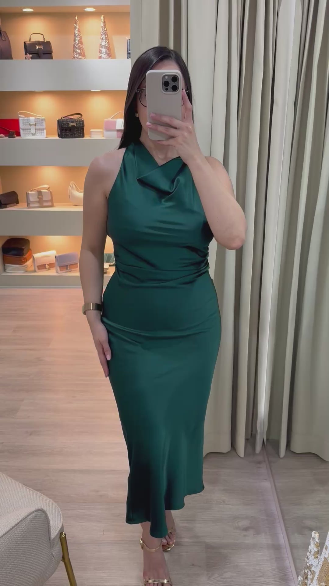Vestido Verde Elegante Largo con Cuello Fruncido