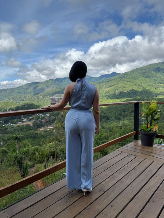 Conjunto azul claro de dos piezas de cuello alto y pantalón