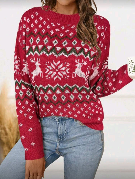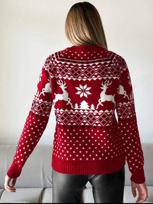 Suéter de Navidad rojo (renos, copos y pinos blancos)