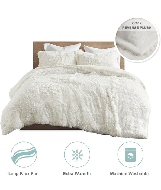 Intelligent Design Malea Shaggy Duvet with Quilted Box Design, Long Faux Fur Comforter Cover Cozy Bedding Set, Matching Shams 90"x90", Blanco, 3 Piezas, Queen