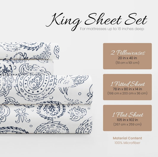 Linen Market 4 Piece King Sheet Set - Breathable, Double-Brushed Patterned Cooling Sheets – Coarse Paisley Navy, Juego de 4 Piezas, Blanco con Diseño Azul, King