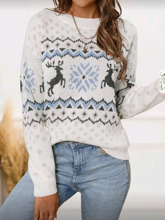 Sueter Blanco con Reno y Copos de Nieve Rojos
