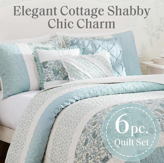 Madison Park 100% Cotton Quilt Set Floral Print Light Teal Aqua, 6 Piezas, Queen